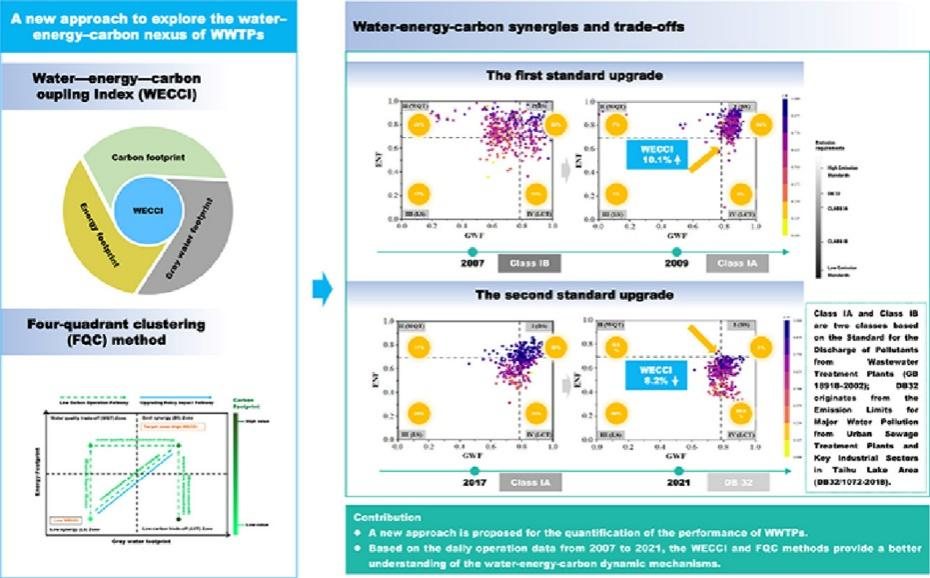在碳中和背景下,水-能源-碳协同作用和权衡机制对于污水处理厂(WWTP)的可持续性至关重要。基于2007年至2021年中国南方某污水处理厂的日运行数据,研究提出了一种探索污水处理厂水-能-碳(WEC)关系的新方法,即开发水-能-碳耦合指数(WECCI)和四象限聚类(FQC)方法。结果发现,WECCI在第一次标准升级后上升了10.12%,在第二次标准升级后下降了8.20%,表明污水处理厂的转型可能会导致整体绩效发生意想不到的变化。基于FQC方法,第一次标准升级后85.64%的运行数据主要集中在WEC最佳协同区,而第二次标准升级后58.52%的运行数据主要集中在低碳权衡区。这项研究表明,WECCI和FQC是定量评估WWTPs综合性能的必要工具,可以更好地理解WWTPs复杂的WEC机制,从而促进WWTPs向碳中和的可持续转型。