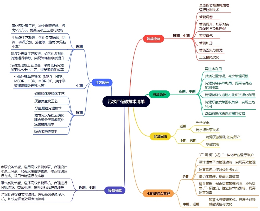 从工艺改进、设备节能、智能控制、资源循环、能源回收、“水-能-碳”综合管理等六个方面,构建了污水处理厂低碳技术清单,并建立了与地域特色相适应的污水处理厂运行综合评估体系。