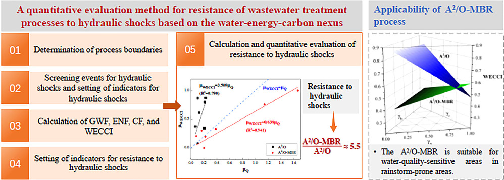 基于水-能-碳的污水处理工艺抗水力冲击能力定量评价方法,包括五步骤:①工艺边界确定;②水力冲击事件筛选与水力冲击指标(雨天水量相比旱天的增加百分比μQ)设定;③水-能-碳指标计算(灰水足迹GWF、能源足迹ENF、碳足迹CF、水能碳耦合指数WECCI);④抗水力冲击强度指标的设定(GWF、ENF、CF、WECCI对于水力冲击的响应变化,μGWF、μENF、μCF和μWECCI);⑤抗水力冲击能力的计算与量化评估。